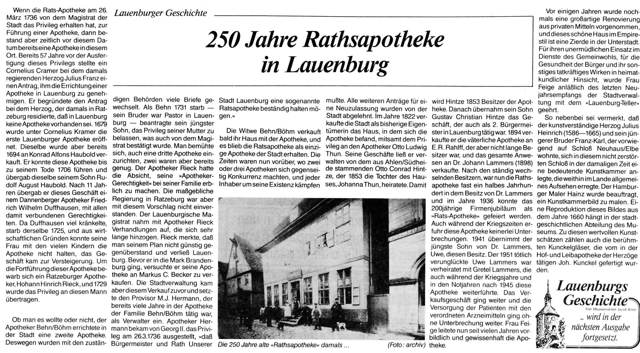 Chronik der Stadt Lauenburg/Elbe: Inhaltsverzeichnis (Auszug) Buch, herausgegeben vom Magistrat der Stadt Lauenburg/Elbe, 1993. Die beiden folgenden Beiträge hat Jacob Kron geschrieben: | |||